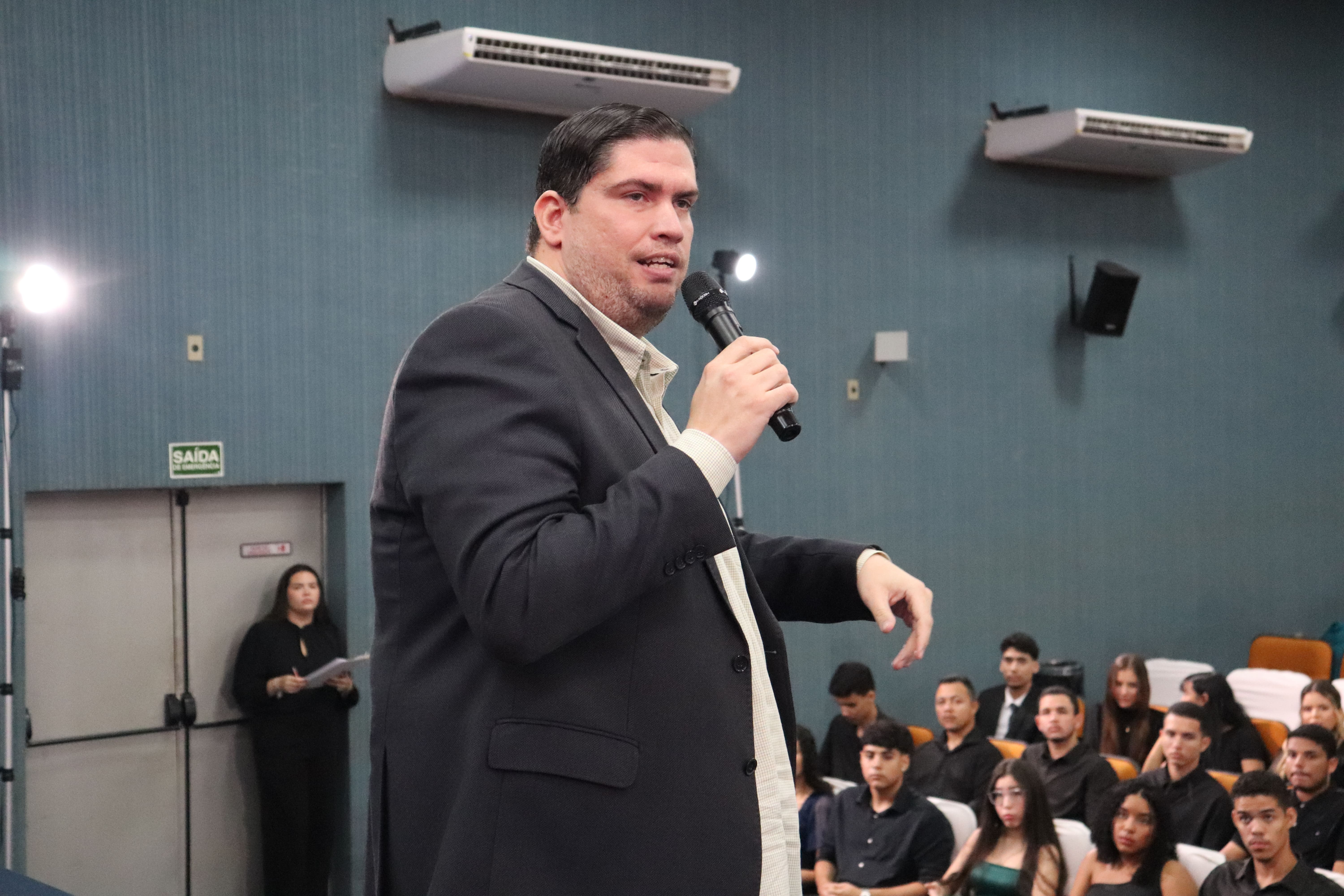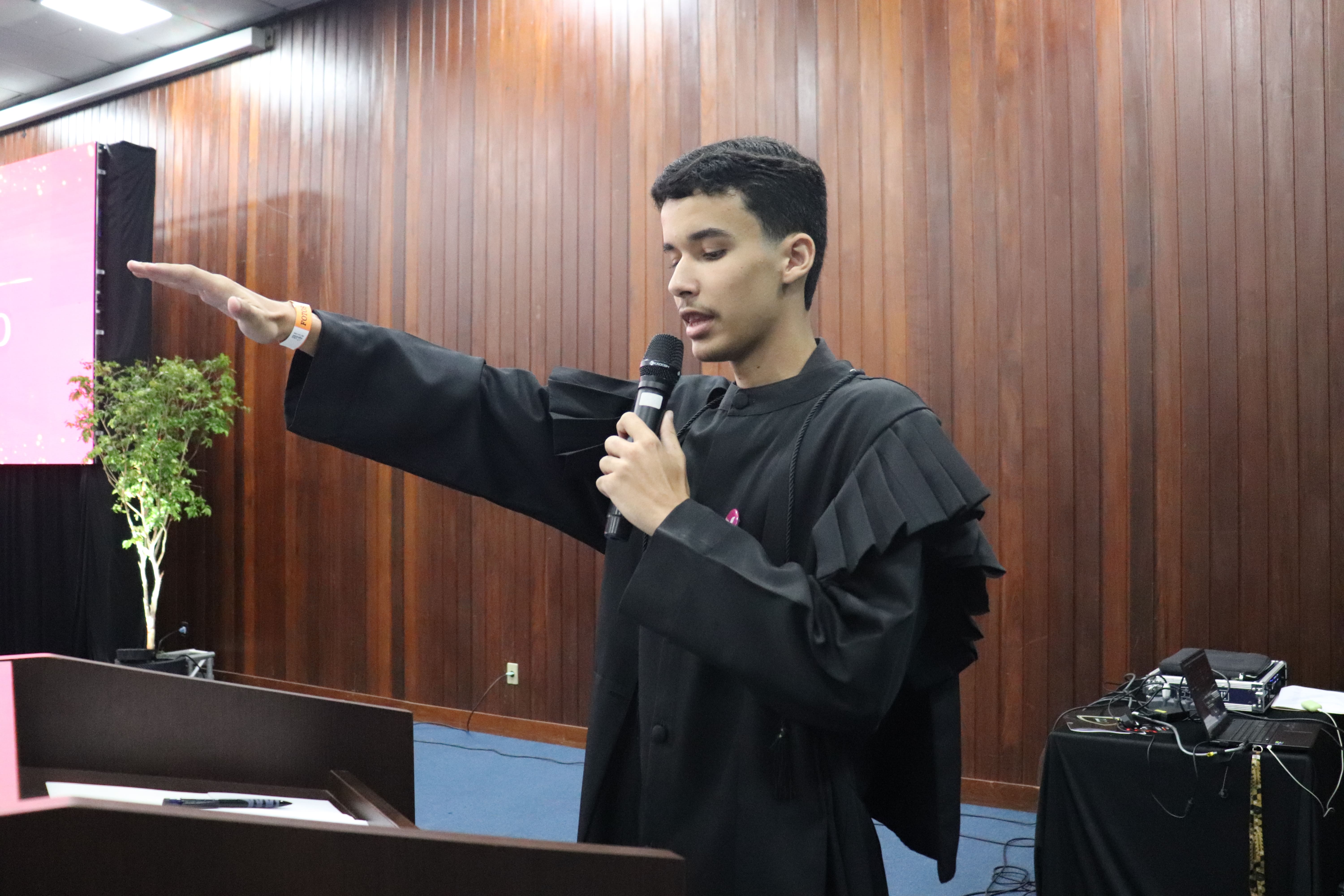 A primeira cerimônia foi realizada às 10h, contando com a presença do reitor Edemilson Marques, do desembargador Manoel de Sousa Dourado, da professora mestre Sara Morgana Silva Carvalho Lopes, integrante da coordenação do curso de Direito, e do professor Livio Santos, docente da graduação.